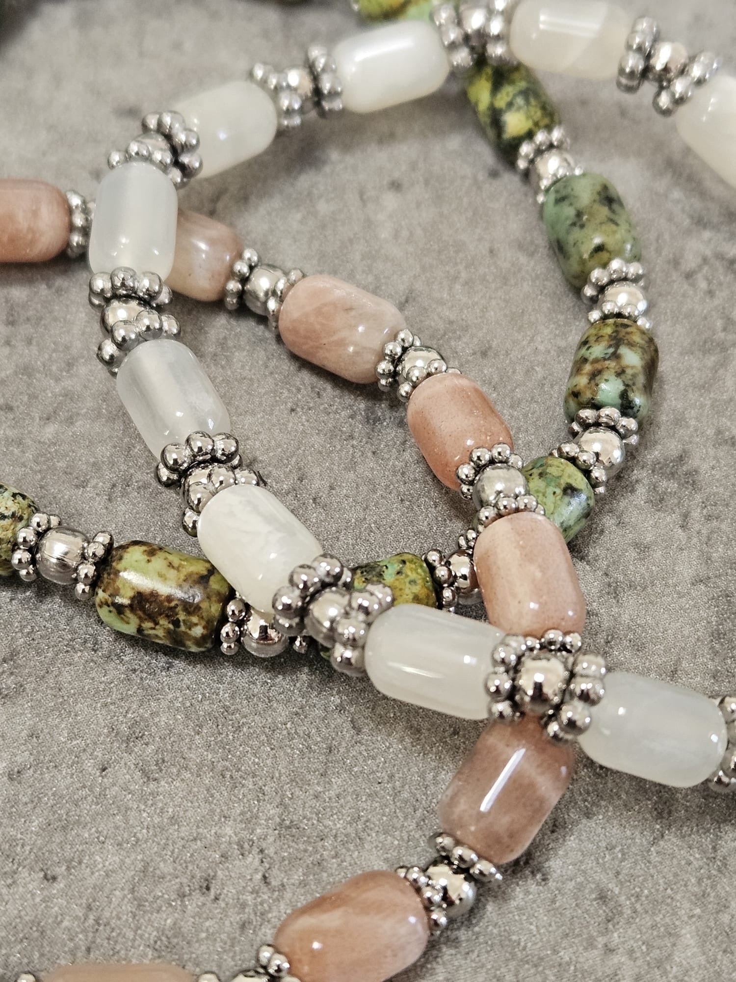 Craquez pour le charme authentique du bracelet Louisa, un modèle délicatement façonné à la main dans notre atelier. Alliant finesse et caractère, il est composé de pierres naturelles soigneusement sélectionnées et de perles en acier inoxydable argenté, pour une tenue élégante et durable au quotidien.
