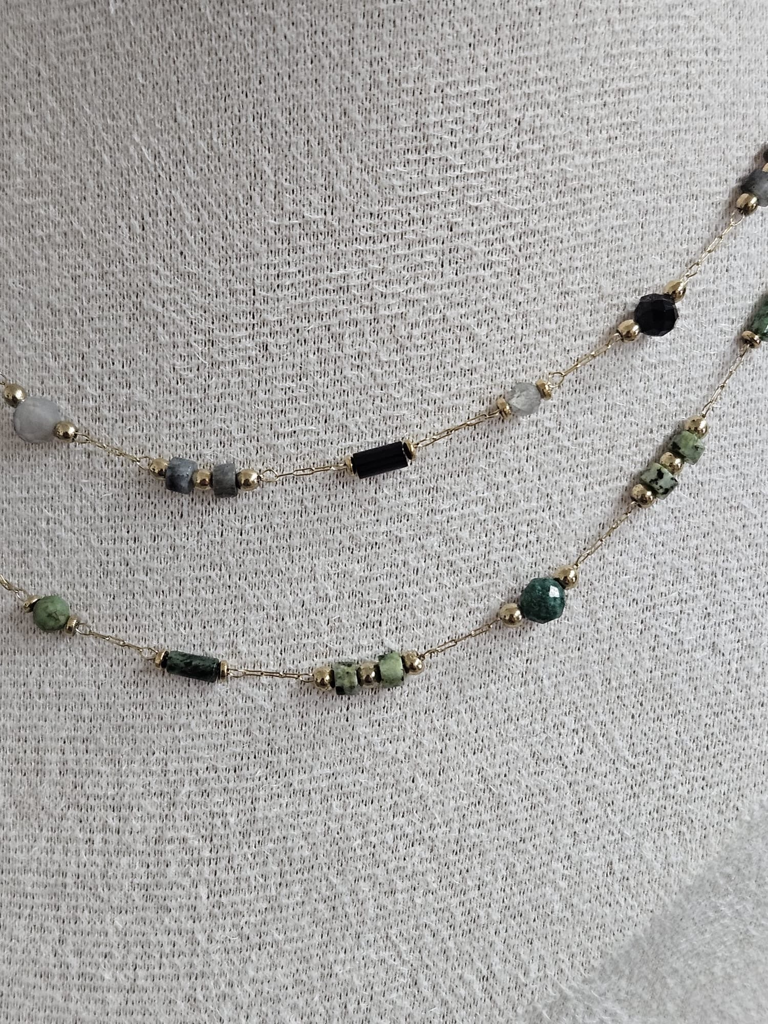 Sublimez vos tenues avec ce collier raffiné qui allie la brillance de l’acier inoxydable à l’authenticité des pierres naturelles.