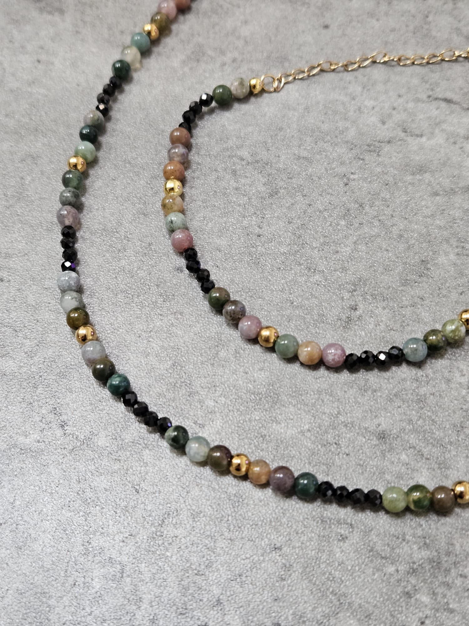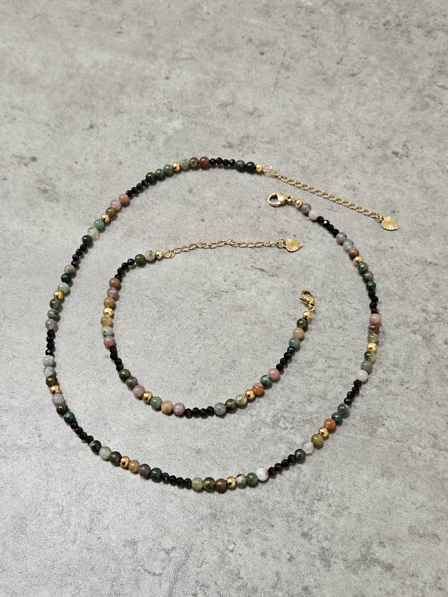 Sublimez votre style tout en profitant des bienfaits naturels des pierres avec ce magnifique ensemble collier et bracelet en Agate Indienne et Spinelle Noire.